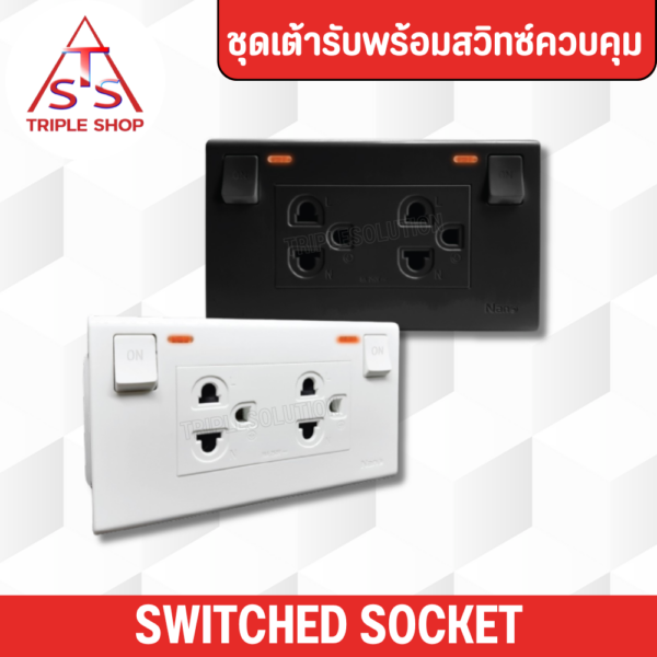 NANO ชุดเต้ารับคู่+สวิทซ์ควบคุมเปิด-ปิด แบบมีไฟ มีกราวน์&ม่านนิรภัย